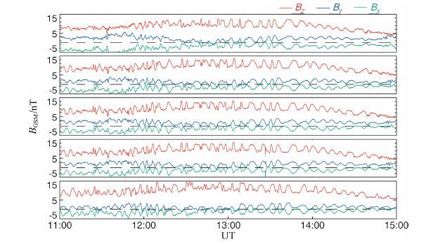 图 2 THEMIS五颗卫星GSM 坐标系下观测到的ULF波图像 Fig. 2 The ULF wave in the GSM coordinate system observed by five THEMIS satellites. |