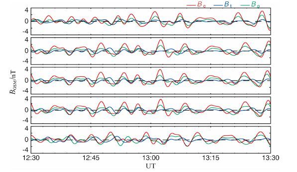图 2给出了2007年3月3日THEMIS观测到的磁场数据,绿色曲线代表Bx分量,蓝色曲线为By,红色曲线为Bz.5颗卫星同时观测到了相似的ULF波,持续时间近4h, 周期约在4~7 min, 振幅约为5~10nT,Z方向扰动较强.P3、P1、P5观测到的波形相似.部分时段存在频散现象,波幅大约从13:40UT 开始衰减.
