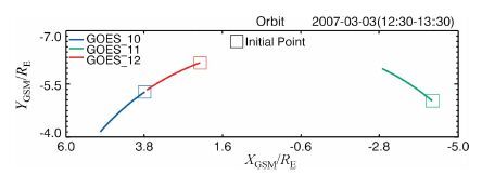 2.2 GOES卫星观测图 6给出了2007 年3 月3 日12:30~13:30UT 期间GOES10、GOES10、GOES12 等卫星的在X-Y平面的轨道绿色线为GOES_11,位于4:00MLT 左右,红色为GOES_12,运行时间区间在9:00MLT 附近,蓝色为GOES_10,在11:00 MLT 附近.三颗同步轨道卫星观测到的Pc5ULF波持续了4个多小时,为了分析其观测与THEMIS卫星观测到的ULF波可能的关系,我们选取12:30~13:30UT范围内的数据分析3颗卫星同一时间内观测到磁场扰动情况.