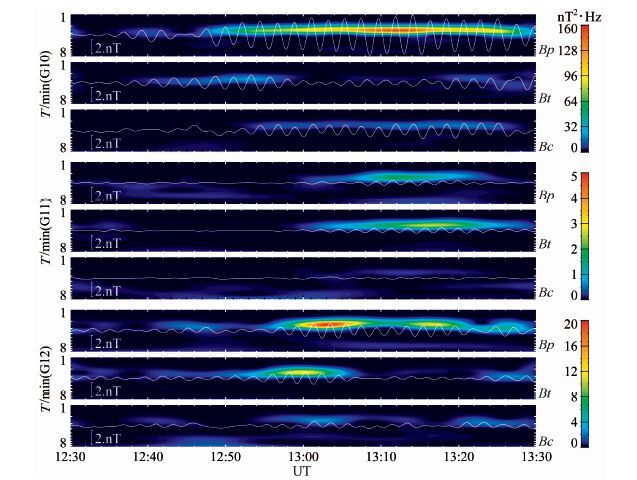 将数据转换到局地场向坐标系中滤波得出周期在1~10min范围内的波形,然后进行小波变换.图 7分别给出GOES_10、GOES_11、GOES_12三颗卫星的小波波谱图,叠加的白色曲线为Pc5 在场向坐标系下的滤波后的三个分量.GOES_10中波动持续时间最长且扰动幅度较大,最大振幅在4~5nT,且p方向最强,t方向次之,c方向最弱,同时三分量都给出振幅周期性的减弱和增强,结构类似于波包.GOES_11观测的p分量和t分量在13:00UT 以后增强,在13:15UT 左右达到最大值,然后开始减弱,c分量一直较弱.GOES_12 距离GOES_10 较近,然而波形的扰动强度与前者相差较大,三个方向扰动都较弱,在所取时间区间内,t方向由开始的最强变到最弱,再到次强,p方向由开始的次强变为后来的次强,再到最强,最后衰减到很弱的程度,c方向也有这样的变化过程,同时三个波形都存在波包似的结构,这与GOES_10有很强的相似性.
