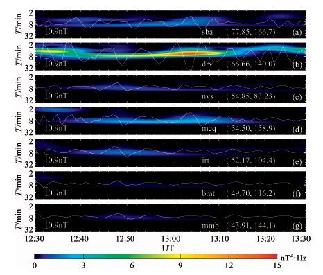 为了比较地面与THEMIS 卫星组观测到的ULF波的一致性,我们选取靠近120°E 附近的7个台站进行分析,取H分量给出小波功率谱如图 8所示:白色线为磁场扰动滤波后的图像,带通为2~10min, 填充图为小波功率谱,从上到下为纬度的由高到底排列,(a)、(b)、(c)、(d)、(e)、(f)、(g)中最大值对应的周期为7.6、5.8、7.6、8.3、7.6、5.8、7.6min, 功率谱最大值分别为1.92、14.5、0.97、3.16、1.59、0.25、0.45,可以看出扰动随纬度升高而增强的趋势,在纬度66°附近达到最大,然后开始衰减.取纬度相差不大的(c)、(d)、(e)三者对比可以发现,同一纬度上越靠近140°E,磁场的扰动越强烈.Dumontd′Urville台站在经度和纬度上与THEMIS卫星相似,观测到波形和最强功率谱对应的周期与THEMIS也有很强的一致性,13:00UT 之前和13:15UT之后出现的频散也符合的很好,ScottBase(a)和MCQuarieIsland(d)由于纬度接近Dumontd′Urville台站,观测到的波形也有一定的相似性,由此我们可以判断卫星观测与地面观测在区域和波形上具有很好地一致性,两者都可以很好地用来研究脉动的性质.