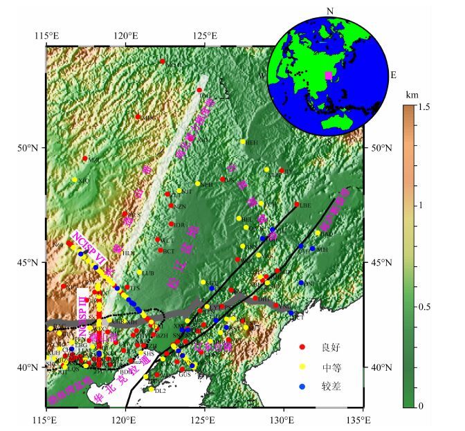 图 1 研究区域、台站以及地震分布 图中圆点代表本文所用到的224个台站位置,不同颜色代表不同的数据质量(见右下插图).粗灰线代表华北克拉通的北部边界[44].细黑线和粗白线分别标明郯庐断裂带和南北重力梯度带的位置.右上插图表明本文所用远震事件的分布情况.图中燕山带(黑色圆点所围区域)参照郑亚东等[14]结果. Fig. 1 Map showing the study region and distribution of stations and earthquakes Solid circles show the locations of the stations used, different colors indicate different data quality (see lower-right inset).Thick gray line shows the northern border of the North China Craton [44].Thin black lines and thick white line denote the Tanlu Fault Zone and North- South Gravity Lineament, respectively.The earthquakes distribution is shown in the up-right inset.The spatial range of the Yanshan Belt (outlined with black dots) is from Zheng et al.[4]. |