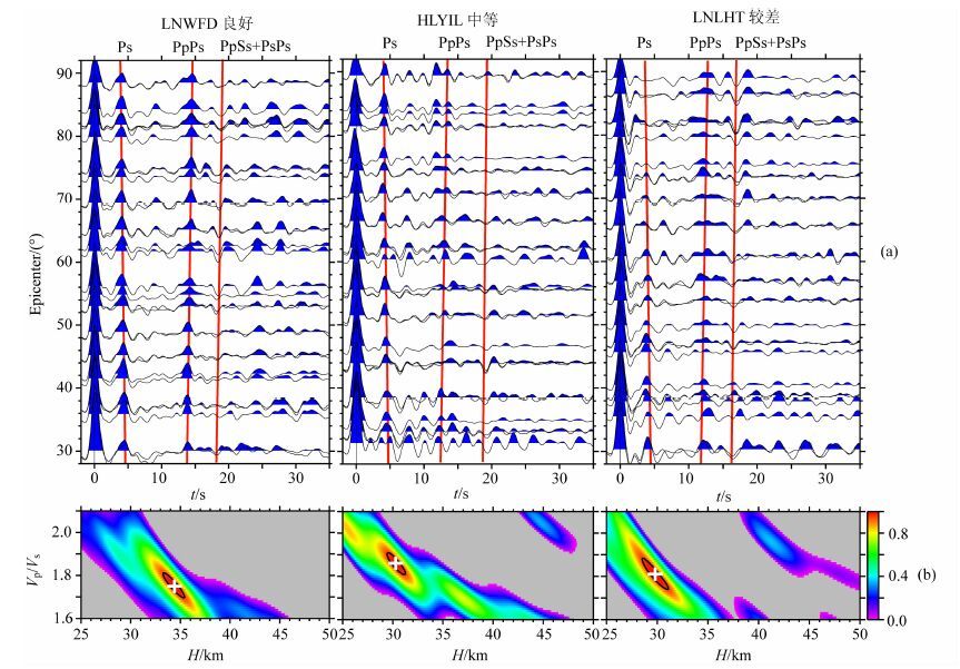 本文采用最大熵谱反褶积方法提取接收函数[32-33],然后在0.03~0.5 Hz范围内滤波(该频段充分平衡了高频噪声干扰和低频较低分辨率的影响).在人工挑选接收函数过程中,由于不同台站数据的质量存在一定差别,我们根据Moho面Ps转换波和多次反射波的波形特征和识别程度,把台站数据分为三类(图 2).如果Ps和PpPs震相清晰并且具有很好的一致性,这些台站列入“良好"、如台站LNWFD;如果Ps震相容易识别,但是PpPs波却受到某种程度干扰,则为“中等",例如台站HLYIL;假如Ps和PpPs都受到干扰,则为“较差",例如台站LNLHT.通过分类,良好、中等和较差的台站数目分别为112,87,25(图 1和表 1),其中绝大多数数据较差的台站位于盆地边缘和构造带交界处.