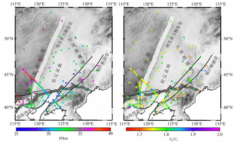 如图 3所示,研究区域地壳厚度整体上从松辽盆地(~30km)向四周造山带逐渐增加.具体表现为:辽东台隆地壳中间厚四周薄,主要在29~35km变化,平均值~32km;燕山带地壳厚度由东往西逐渐增加,主要在28~40km 变化,平均值~34km;兴蒙造山带地壳东薄西厚,主要在31~39km 变化,平均值为~35km;吉黑褶皱带则表现为地壳南东厚北西薄,主要在28~37km 变化,平均值为~33km.相比于东侧吉黑褶皱带和辽东台隆<37km厚的地壳,西侧兴蒙造山带和燕山带的最大地壳厚度接近40km.地壳平均波速比在研究区变化显著,尤其是在松辽盆地和渤海湾盆地周边以及构造边界处和郯庐断裂带附近变化比较复杂,并且出现局部增高(>1.87).在兴蒙造山带和辽东台隆,波速比变化相对较小,都主要在1.71~1.83 范围内变化,平均值都约为1.77;而在燕山带和吉黑褶皱带变化则相对较大,分别在1.70~1.91 和1.72~1.89 范围内变化,平均值也相对稍高(~1.79).