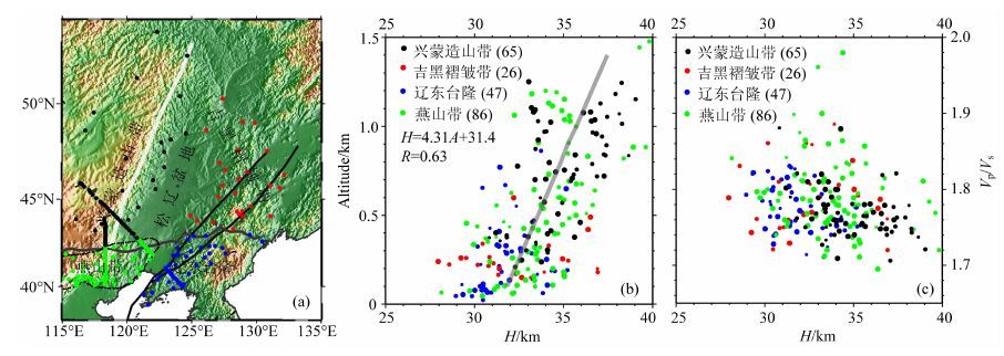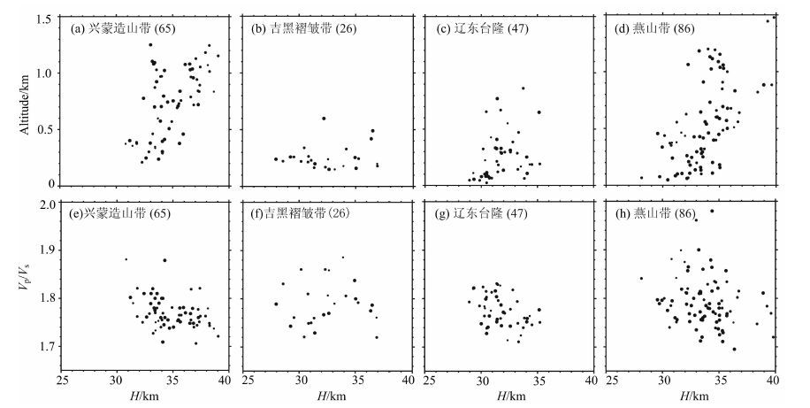 其中,H代表地壳厚度(去掉地形),A表示海拔,单位为km, 相关系数R为0.63.研究区地壳厚度与波速比没有明显的相关性(图 4c).图 5展示了四个构造带各自的地壳厚度与海拔以及波速比的分布.从图中可以看出,兴蒙造山带、辽东台隆和燕山带三个区域的地壳大致随着海拔增高而逐渐增厚,其相关系数R分别为0.57,0.60和0.31,而吉黑褶皱带地壳厚度与海拔则显示出不相关性质(R=0.13),主要表现为地壳厚度从~28km 到~37km 的显著变化,而海拔变化较小(~100-600m).兴蒙造山带、辽东台隆和燕山带的地壳厚度与波速比表现出弱的负相关关系,而吉黑褶皱带则没有这种关系.(尽管本文采用的吉黑褶皱带台站数量相对较少,但分布比较均匀,且在海拔相对较高和较低区域都有覆盖(图 1),因此本文的研究结果基本反映了吉黑褶皱带的地壳结构特征).
