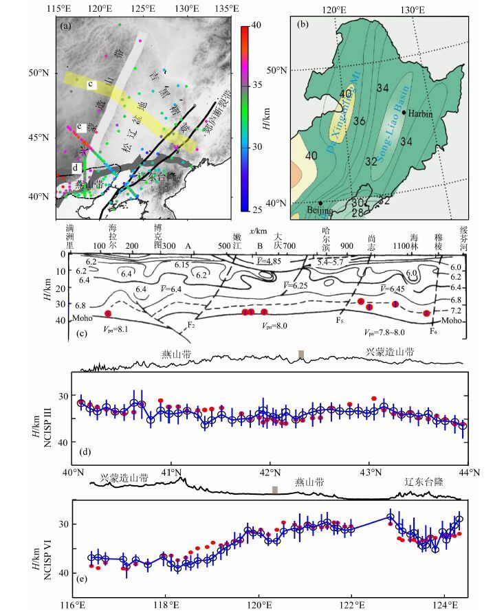 图 6 采用不同地震学方法获得的研究区地壳厚度对比 (a)接收函数H-κ 叠加得到的地壳厚度分布(本文);(b)由人工地震资料得到的地壳厚度分布[26];(c)中国满州里-绥芬河地学断面下方的地壳P波速度[34],红点表示接收函数H-κ 叠加结果;(d)NCISPIII台阵下方接收函数H-κ 叠加结果[15](圆圈)和波形反演结果[35](红点)的对比.(e)NCISPVI台阵下方接收函数H-κ 叠加结果[15](圆圈)和偏移成像结果[36](红点)的对比. Fig. 6 Comparison of crustal thickness by different seismological methods (a) Distribution of H by H-κ stacking of RFs in the study region.(b) Distribution of H by active seismic exploration[26].(c) P wave velocity under the Manzhoufi-Suifenhe Geoscience Transect[34] ,red dots represent H by H-κ stacking of RFs.(d) H on the profile NCISP III from H-κ stacking of RFs[15] (circles) and waveform inversion of RFs[35] (red dots).(e) H on the profile NCISP VI from H-κ stacking of RFs[5] (circles) and receiver function migration[36] (red dots). |