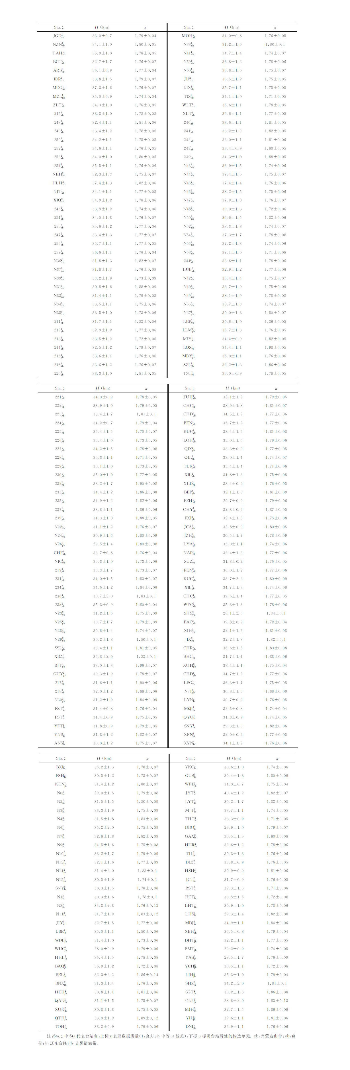 3 结果本文通过对分布相对均匀的固定台站下方接收函数的H-κ 叠加分析,并结合前期对两条线性密集流动台阵的研究结果[15],获得了东北地区和华北克拉通北缘地壳厚度与平均波速比的区域分布(图 3,表 1).
