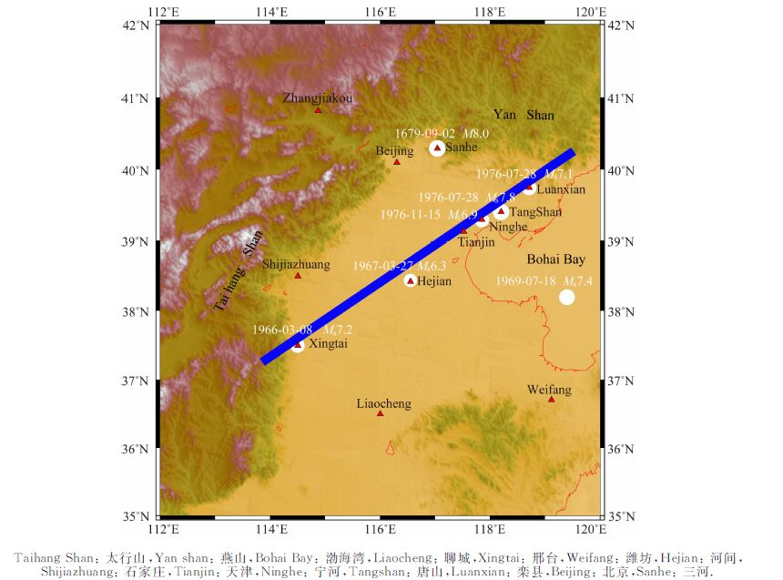 图 1 研究区域 红色三角表示城市地名,白色圆点表示华北地震主震,蓝色实线表示下文(图 7)提到的纵剖面 Fig. 1 Map of the North China basin Red triangles indicate city names.White dots indicate the epicenters of main shocks.Blue line indicates the cross section along several earthquake zones (inFig.7) |