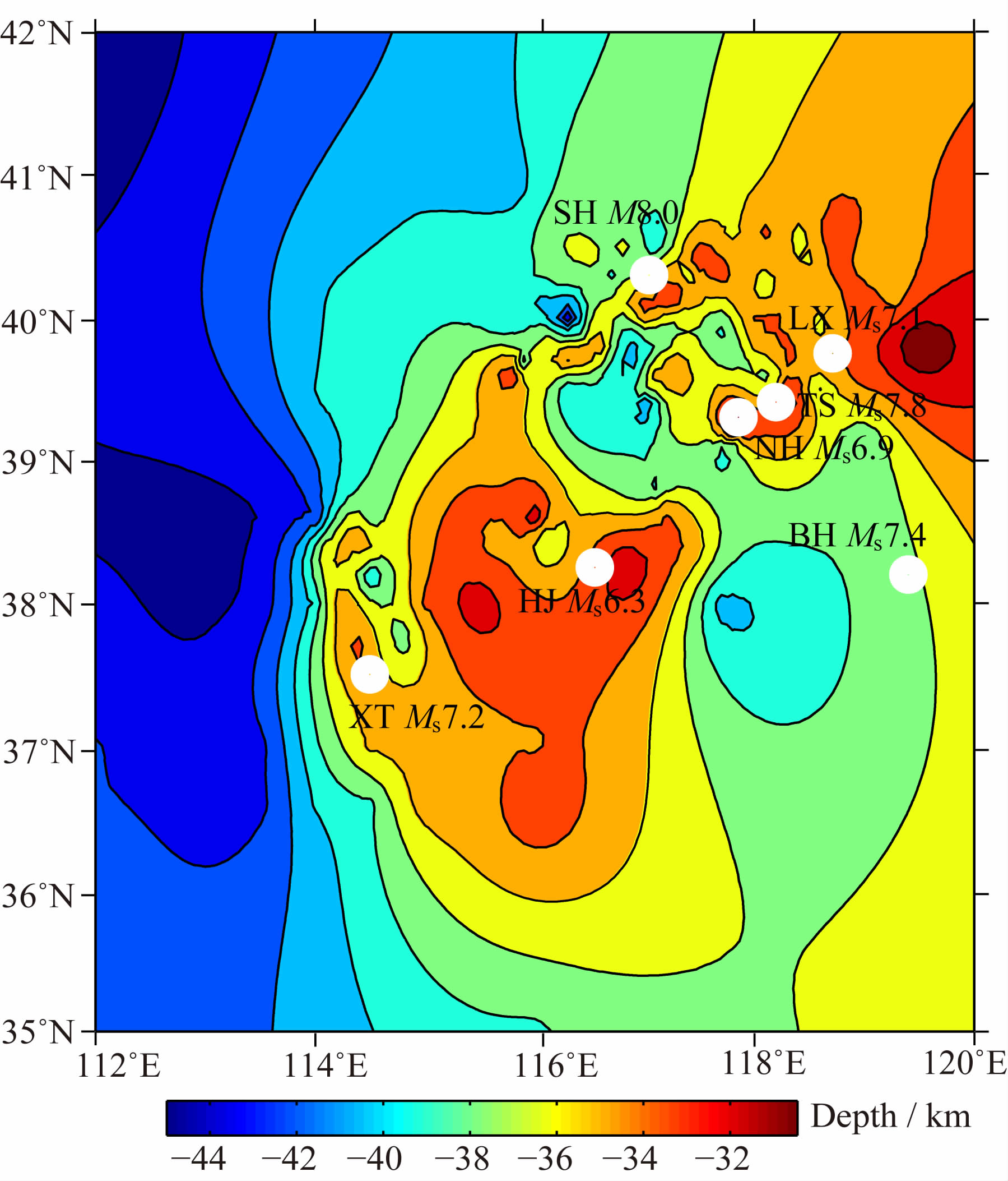 图 2 华北盆地Moho面深度图白色圆圈表示华北地震主震投影. Fig. 2 Depth of Moho surface beneath the North China basin White dots indicate the epicenters of main shocks in the North China basin |