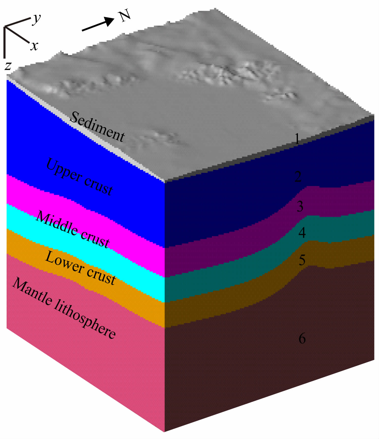 图 3 华北盆地岩石圈模型[9, 11-13, 36-40],尺寸为888km×777km×100km (X×Y×Z) 岩石圈中不同层位用数字标出:编号1为沉积层,编号2 为上地壳,编号3为中地壳上层,编号4为中地壳下层,编号5为下地壳,编号6为岩石圈上地幔. Fig. 3 Model of the lithosphere of North China basin[9, 11-13, 36-40] with the size of 888 km × 777 km×l00 km (X×Y×Z) Different layers are marked by numbers. |
