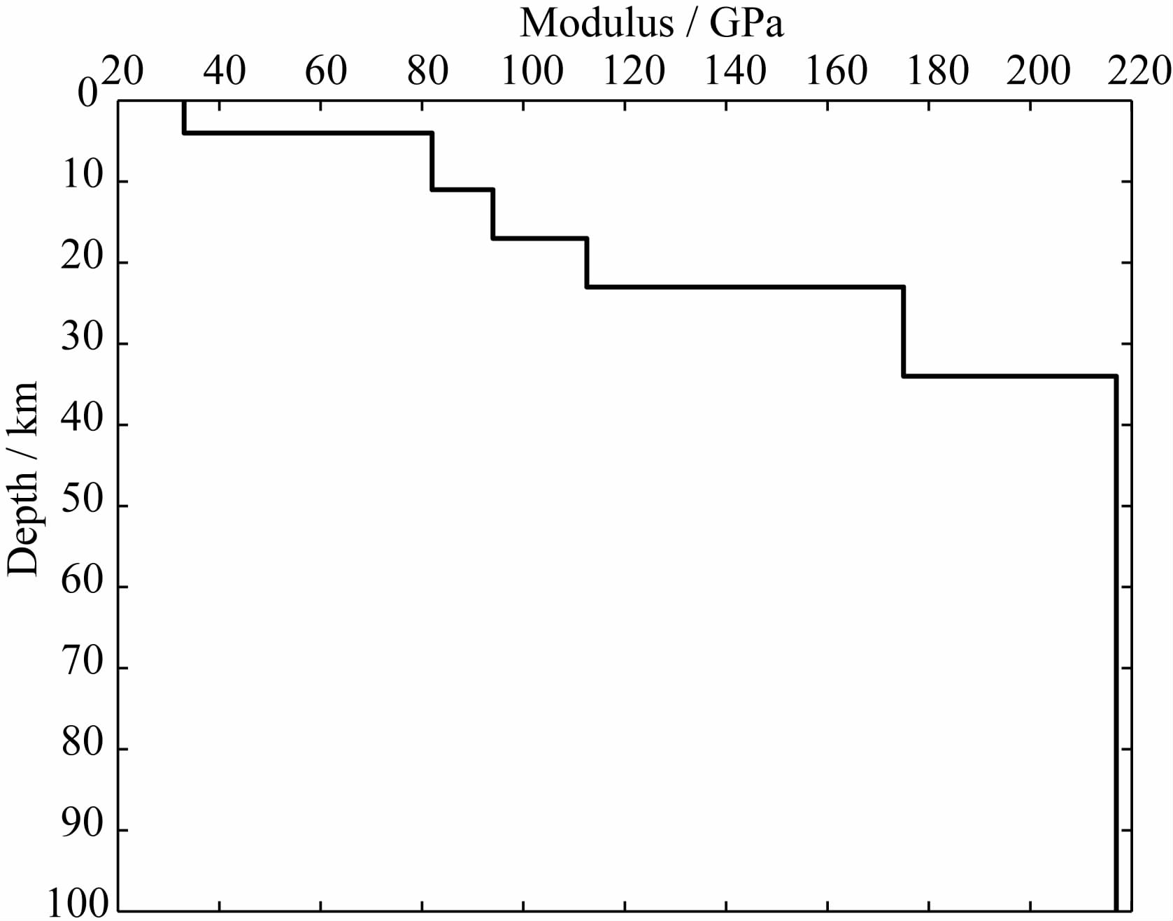 计算所涉及的黏弹性介质的3个物质参数分别为:杨氏模量E,泊松比ν和黏滞系数η.岩石杨氏模量E与泊松比ν 依据波速计算[9, 11-13, 36-40].同一层位的物质参数相同,一般更深的层位地震波速较大,岩石的杨氏模量亦增加,依据所选择物质参数,华北盆地岩石圈100km 深度范围内介质杨氏模量随深度的变化曲线见图 4.