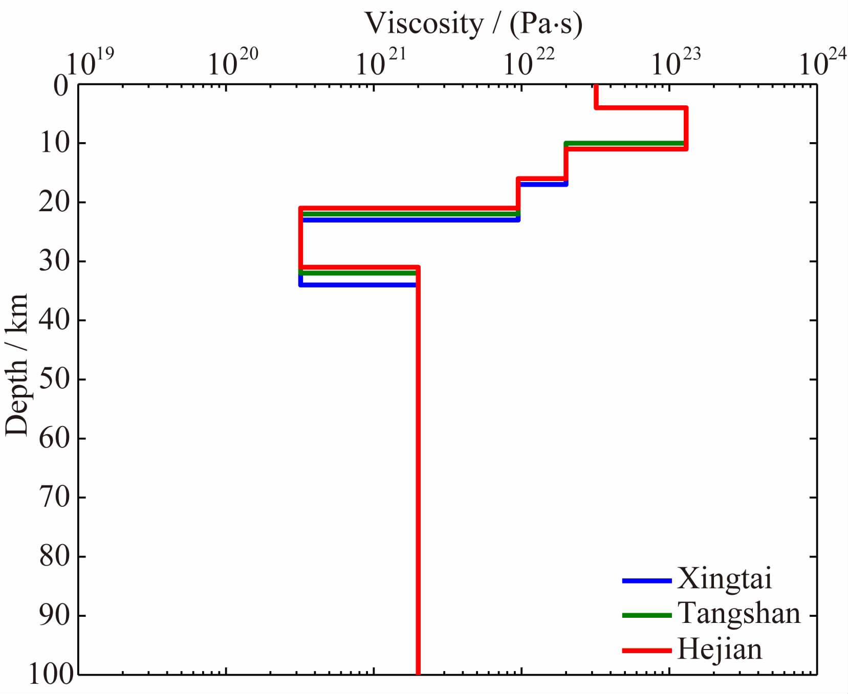 图 5 华北岩石圈各层位岩石介质黏滞系数在邢台、河间与唐山震区随深度变化图[49] Fig. 5 Diagram of viscosity in the lithosphere of the North China basin[49] |