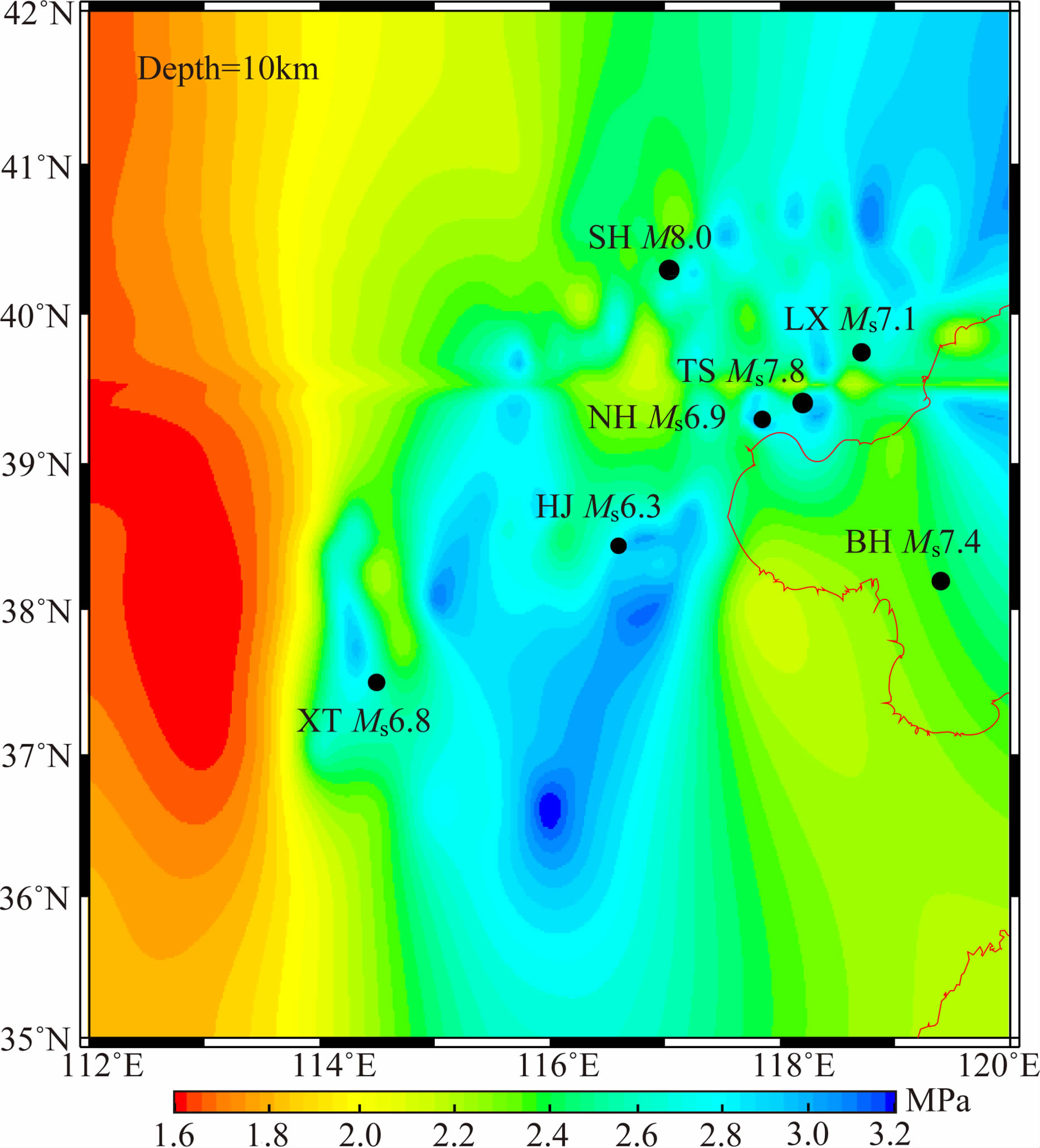 图 6 模型10km 深度处横切面上10000年后最大剪应力积累分布 黑点表示华北地震主震的投影,并标出相应震级.XT:邢台地震,HJ:河间地震,NH:宁河地震,TS:唐山地震,LX:滦县地震,SH:三河地震,BH:渤海地震. Fig. 6 Maximum shear stress accumulation distribution after 10000 years at 10 km depth Black dots indicate projection of the hypocenters of main shocks designated with name and magnitude. |