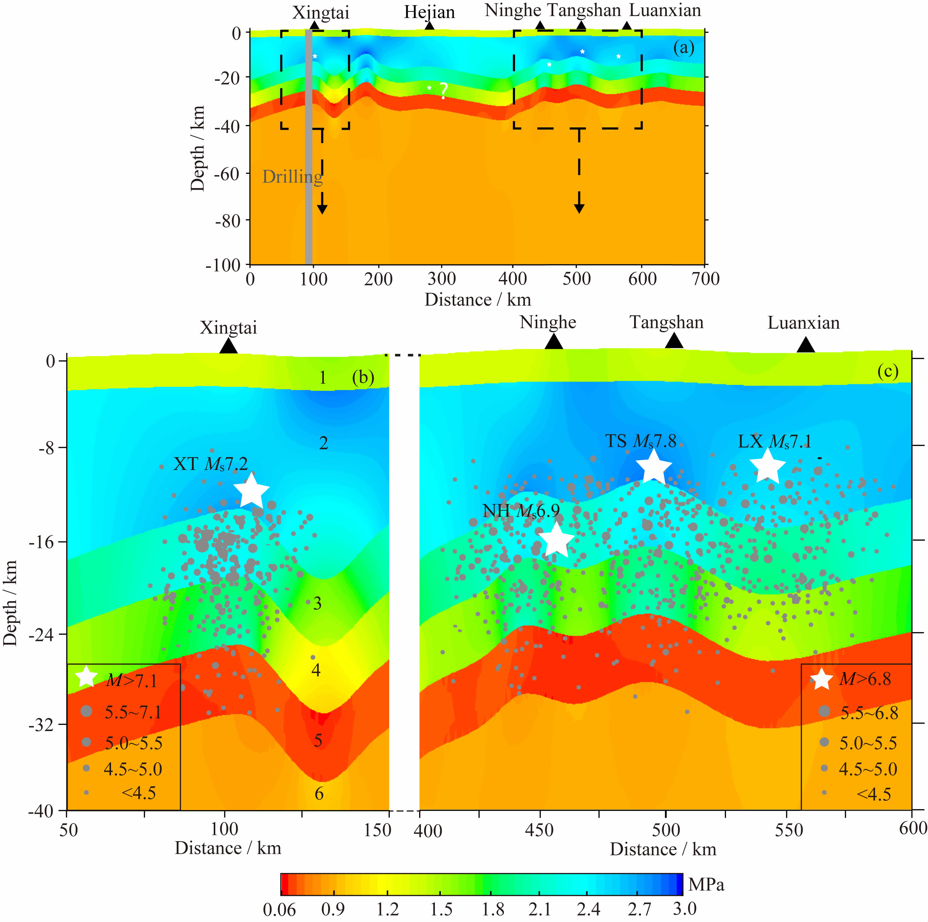 (3) 模型中应力在不同层位的积累速率的差异与华北盆地地震的成层分布现象支持华北岩石圈流变结构的分层特征:脆性(上地壳)-较弱脆性(中地壳上层)-较弱韧性(中地壳下层)-较强韧性(下地壳)-韧性(岩石圈上地幔)的分层结构.