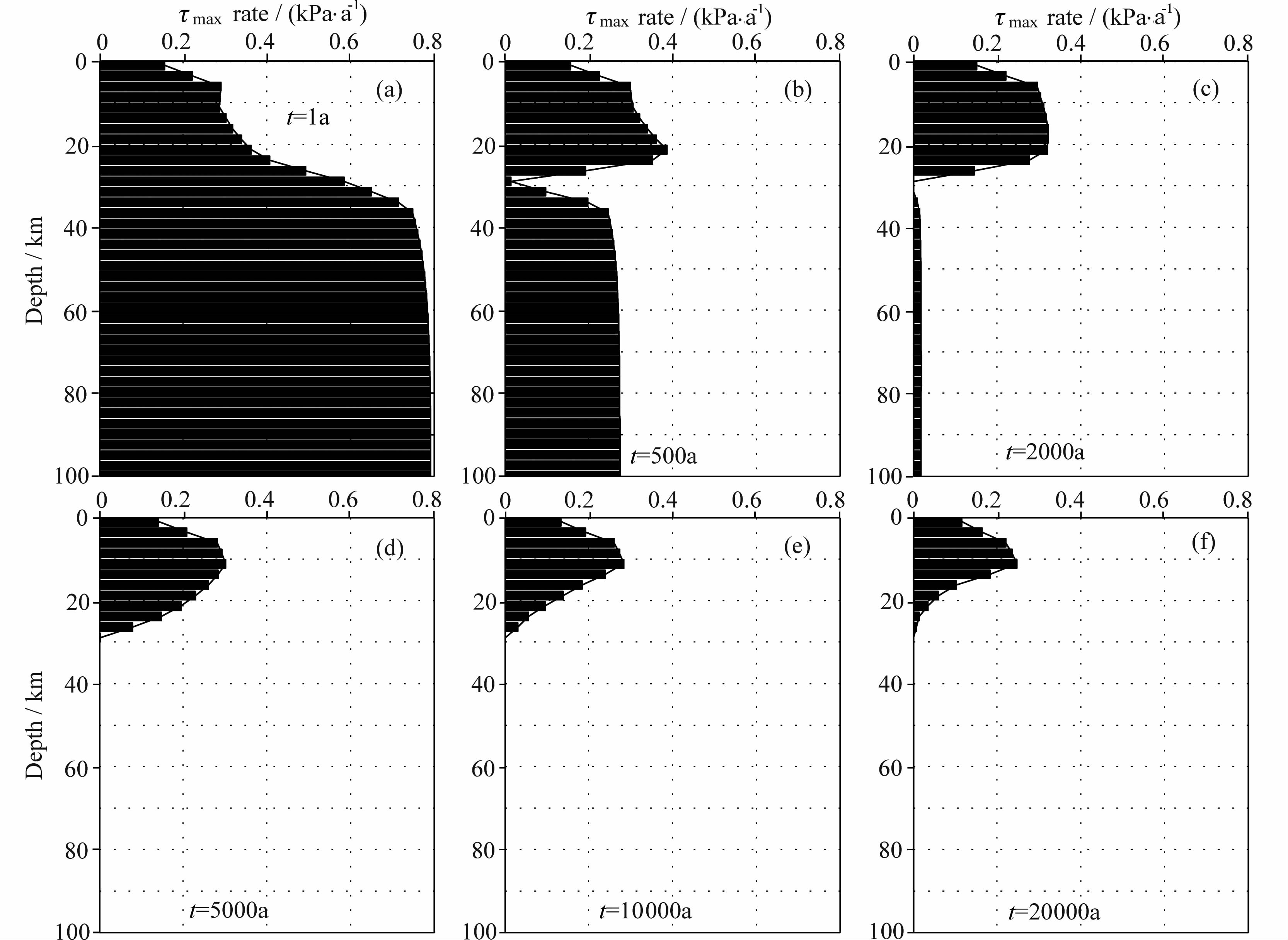 在边界条件加载的第1年(图 8a),增长速率表现为弹性杨氏模量控制的线性增长,不同层位的应力增长率随相应层位的杨氏模量的增大而增加.边界条件作用500年时(图 8b),加载时间超过下地壳(25~32km)的松驰时间,其应力已经趋于稳定不再增长,应力增长率为0.在应力积累5000年时(图 8d),时间接近中地壳下部(19~25km)的松驰时间,该韧性层的应力松驰效应已经开始体现,应力增长率较之前有所减小;此时下地壳与岩石圈上地幔的应力增长速率已为0.当时间持续至10000年,至20000年时,中地壳上层的应力增长速率已经略有所下降,上地壳的应力能保持稳定的增长率,最大剪应力增长率峰值在上地壳底部,大小为0.25kPa/a.