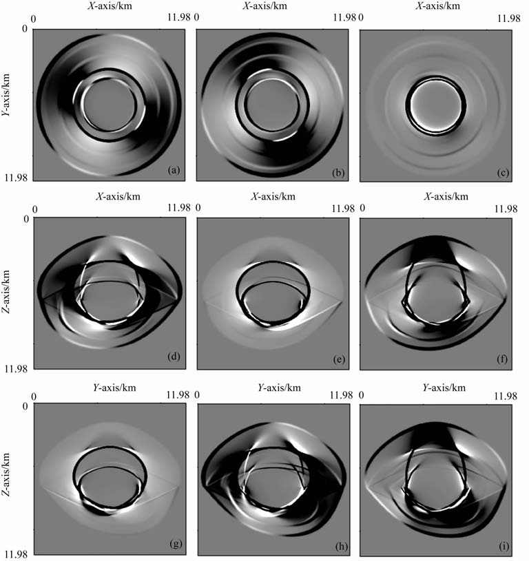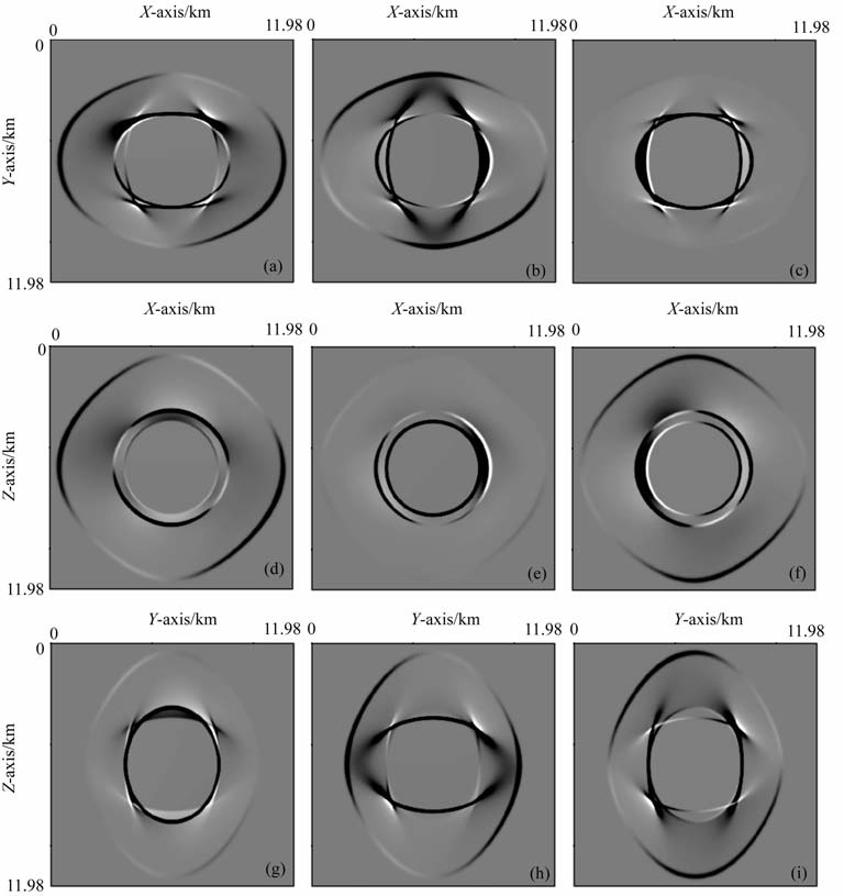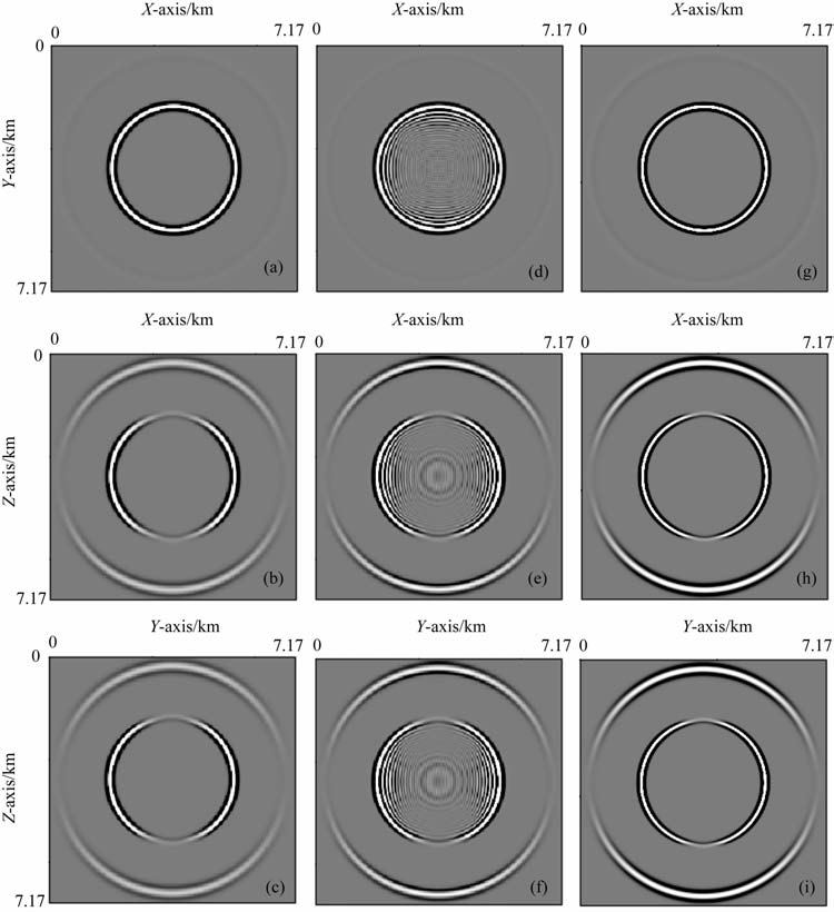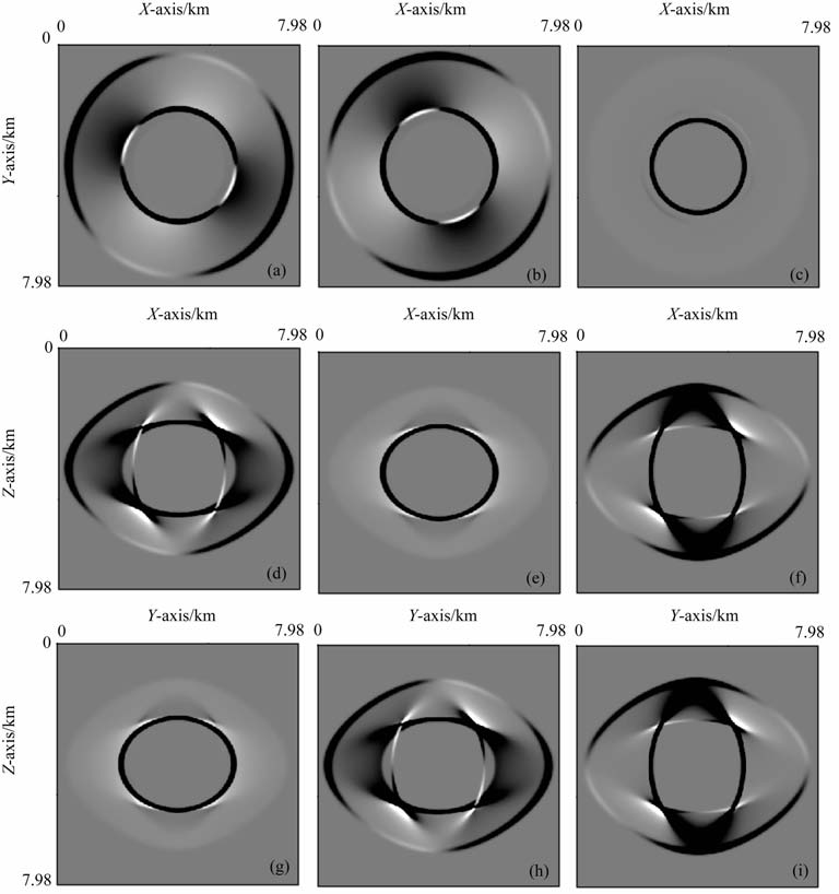 图 3 VTI介质中的弹性波场快照 (a, b, c) ul、u2 u3 在:xoy 截面上;(d, e, f) ul、u2 u3 在:xoz 截面上;(g, h, i) ul、u2 u3 在:yoz 截面上. Fig. 3 The elastic wavefield snapshots in VTI meida (a, b, c) Displacement component ul,u2 and cin xoy-plane; (d, e, f) Displacement component ul,u2 and u3 in xoz-plane; (g, h, i) Displacement component ul,u2 and u3 in yoz-plane. |