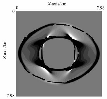 图 7给出了模型4在T=1.62s时刻的波场快照.从快照中我们发现,对称轴的连续变化显著改变了波的传播特征.