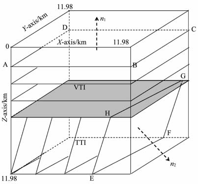 图 5 双层模型(模型3),上层为VTI介质,下层为TTI介质.ABCD和EFGH分别表示上下层介质的各向同性面,n1,n2分别表示上下层介质的对称轴 Fig. 5 Two-layer model (model 3),the upper layer is VTI and the lower is TTI media.ABCDand EFGH denote the isotropic plane, n1 and n2 denote the symmetry axis of the upper and lowrr media respectively |
