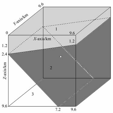 图 8 具有倾斜界面的三层介质模型(模型5) Fig. 8 Three-layer model with tilted discontinue surface (model 5) |