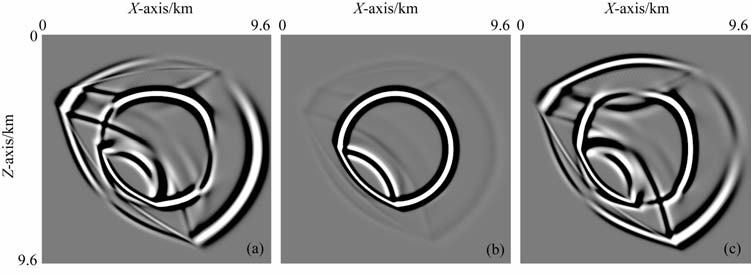 图 9 模型5中u1(a)、u2(b)、u3(c)在xoz截面上T = 0.9 s时弹性波场快照 Fig. 9 The wave-field snapshots of displacement component u1(a),u2(b) and u3(c) in xoz-plane, respectively, in themodel 5 (T=0.9 s) |