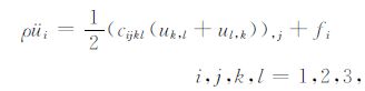 为了叙述方便,我们引入记号U= {u1,u2,u3,u1,1,u1,2,u1,3,u2,1,u2,2,u2,3,u3,1,u3,2,u3,3}T 表示波位移及其梯度分量组成的向量,变量$W=\dot{U}=\partial U/\partial t$称为粒子“速度",变量$P=\dot{W}=\ddot{U}={{\partial }^{2}}U/\partial {{t}^{2}}$称为粒子“加速度".