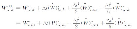 对于公式(3),考虑到已由公式(2)计算得到了最新的粒子速度Wi,j,kn+1,因此,我们可借鉴求解线性代数方程组Gauss-Seidel方法的类似思想,采用Wi,j,kn+1和Wi,j,kn的一个加权组合来替代公式(3)中的Wi,j,kn,从而得到新的位移更新公式[17, 19]: