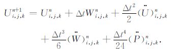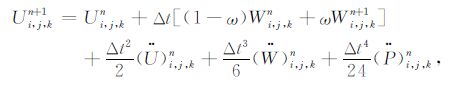 要联合使用公式(2)和(4)实现时间方向上的推进计算,显然必须首先计算U、W和P对时间的高阶偏导数.如果直接离散公式(2)和公式(4)中的高阶时间偏导数,则需要存储多个时间层上的波位移、粒子速度及其梯度值,内存需求量庞大.注意到在公式(2)和(4)中,只含有波位移和粒子速度关于时间的偶数阶偏导数,所以我们可采取Dablain的思想,利用方程(1),首先将时间的高阶偏导数转化为空间的高阶偏导数[14, 16],然后再利用Yang等给出的高阶空间偏导数的逼近公式[27]来计算公式(2)和(4)中所涉及到的这些高阶空间偏导数.