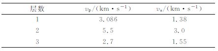 4.5 模型5 具有倾斜界面的三层介质模型因为有限差分方法的网格不能准确刻画倾斜间断面,所以使用有限差分方法模拟地震波场时,在倾斜间断面处容易产生数值频散和人工绕射.模型5(图 8)用来说明并行WNAD 算法能较好地压制弹性波在具有较大速度反差的倾斜间断面附近的人工噪声.图 8所给出的模型分为三个不同的区域,每个区域内的介质速度如表 1所示.从表 1知,不同区域之间最大的层速度反差为2.17.震源位于介质中心,震源函数同模型1.