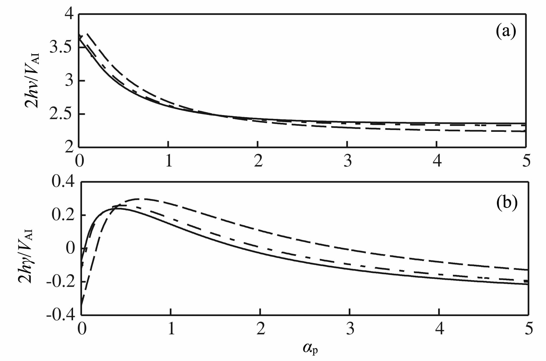 图 2 考虑Hall电导率时谐振频率(a)与增长率(b)I=90°,80°,70°(实线,点划线,双划线),κpx=κpy=0.02,αh=αp Fig. 2 Resonant frequency ( a) and growth rate (b) for I = 90° 80° 70° (solid line, dash-doted line, dashed line),dashedline),κpx=κpy=0.02 and αh=αp |