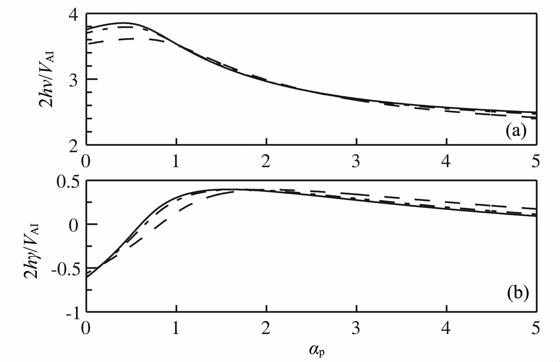 图 1显示的是根据(15)式,通过数值计算得出的第一谐振频率与增长率,背景参数为kx=0.1km-1,ε=0.1,αh=0,κpx=0.02,τ=0.横坐标为归一化电离层Pederson电导率αp.由于电离层反馈不稳定性主要发生在极区附近,所以分别选择了I=90°(实线)、80°(点划线)、70°(双划线)的情况.由图中可以看出,当I=90°,谐振频率随αp 的增大而减小,增长率随αp 先增大而后减小,在αp=0.3附近达到最大值.I=80°时谐振频率与增长率的变化与I=90°类似,但增长率有所增大.I=70°时增长率的最大值变大,并且谐振频率与增长率整体向αp 增大的方向偏移,这是等效电离层电导率作用的结果.αp$\gg $1 时,谐振频率随I的增大而增大,而增长率则减小,这也印证了前述分析.
