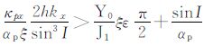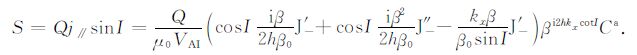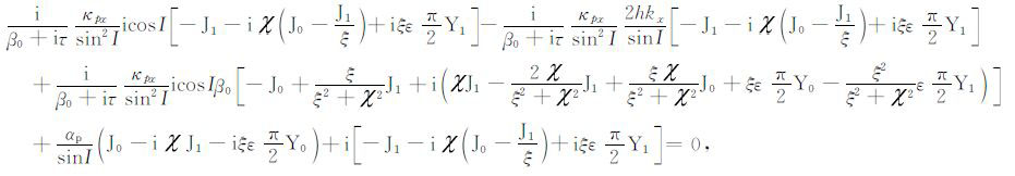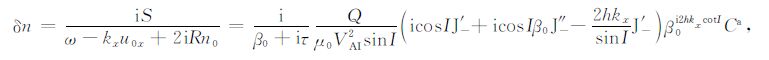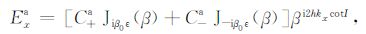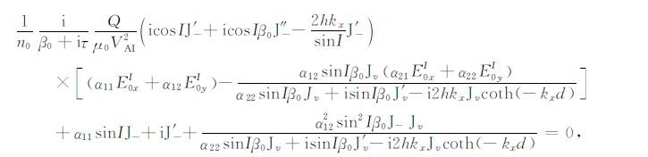 根据Pokhotelov[16],在k⊥h$\gg $1条件下,β≈β0 附近,Bessel函数以指数形式变化:Jkxh(η)∝exp(-kxz),所以J′kxh=2hkxJkxh/η.另外在k⊥d$\gg $1条件下,即波的水平尺度远小于大气层高度,coth(-kxd)= -1.令κpx=Ex0/n0·αpQ/(μ0VAI2)、κpy=Ey0/n0·αpQ/(μ0VAI2),则(14)式可写为
