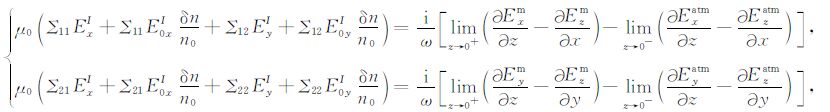 其中E0xI,E0yI分别为电离层x、y方向的背景电场,并且在处理中忽略了扰动的二阶项.方程右边表达式物理量中的上标m, atm 分别代表磁层和大气层.