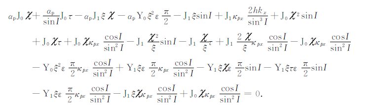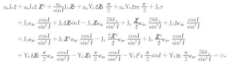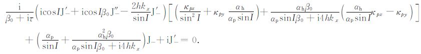 3 电离层反馈不稳定性取磁层ULF波的解为Exa=C-aJ-iβ0ε(β)βi2hkxcotI与Eyf=C+fJv(η),即只考虑剪切出射波与压缩波随高度衰减的情况(值得注意的是解的选取需要考虑磁场的方向,由于本文选取的背景磁场方向向上,所以选取剪切模的解为Exa= C-a J-iβ0ε(β)βi2hkxcotI,而当背景磁场方向向下即sinI<0 时,剪切模的解为Exa=C+aJiβ0ε(β)βi2hkxcotI),与大气层的解代入(13)式.令αmn=μ0VAIΣmn、αp =μ0VAIΣp、αh =μ0VAIΣh 表示归一化电离层电导率,得到色散关系