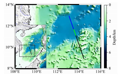 图 1 观测海域的海底地形和地震测线及涡旋的位置.蓝线和黑线位置连续,但调查时间间隔将近5 h,绿线为蓝线的一部分,指示涡旋的空间范围 Fig. 1 Seafloor topography in the study area and locations of the seismic line and mesoscale eddy.The blue line and black line represent the seismic section with the time gap of nearly 5 hours, the green line is part of the blue line, represents the range of mesoscale eddy |