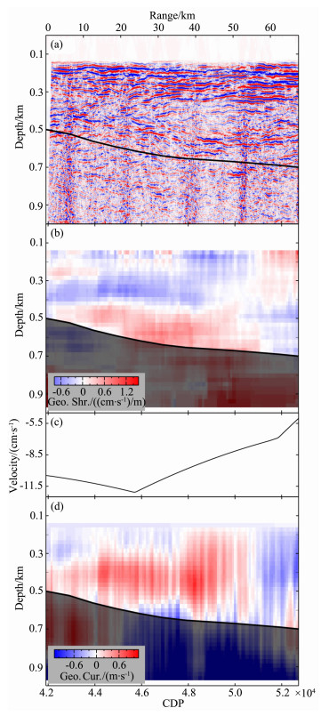 4 结果与讨论‘地转平衡’的假设在RO《1的情况下近似成立.罗斯贝数定义为:RO=U/fL,其中U和L分别为特征速度和特征长度.在本研究海域f近似为3×10-5s-1, 取U近似为0.1 m • s-1, 在L > 35 km时RO < 0.1.我们以这个值为参考给定计算中用到的数据窗的宽度和有效的反射同相轴长度,密度使用WOD(WorldOceanDatabase)的历史数据,计算结果如图 3b所示.物理海洋学在计算绝对地转流时一般选择深层为基准层对地转流速的垂向梯度进行垂向积分[26],我们考虑到:其一,究竟以多深为基准层,选择标准不一,不同海域情况也不相同;其二,我们方法计算结果的可信度随深度而降低,如果选择深层为基准流,计算误差会从下而上积累,从而影响整个计算结果,因此我们选择表面流为基准流.首先从海表面地转流场中提取出垂直于地震测线的流速数据,如图 3c所示,然后以此为积分起点对计算的地转流速的垂向梯度进行垂向积分得到绝对流速的垂向剖面,结果如图 3d所示.