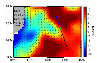 图 4 南海的海面高度异常图和海表面地转流矢量图,来自于AVISO, 测量时间为2009年5月27日 Fig. 4 The Sea Level Anomalies and Sea Surface GeostrophicCurrents of South China Sea, 2009. 05. 27, AVISO |