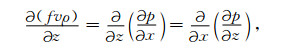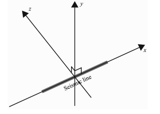 传统海洋学研究中坐标系的定义方式一般为以东向、北向和垂直向上为x轴、y轴和z轴的正方向.由于一般情况下地震测线并非沿着坐标轴布设,利用地震海洋学方法进行地转流速的垂向梯度的计算和表示过程中存在一定的困难.为了解决这个问题,我们利用如下方式定义坐标系:以地震测线方向为x轴正方向,在水平面上逆时针旋转90°为y轴正方向,z轴正方向定义为垂直向上,如图 5所示.在这个坐标系之下,地转流的控制方程为: