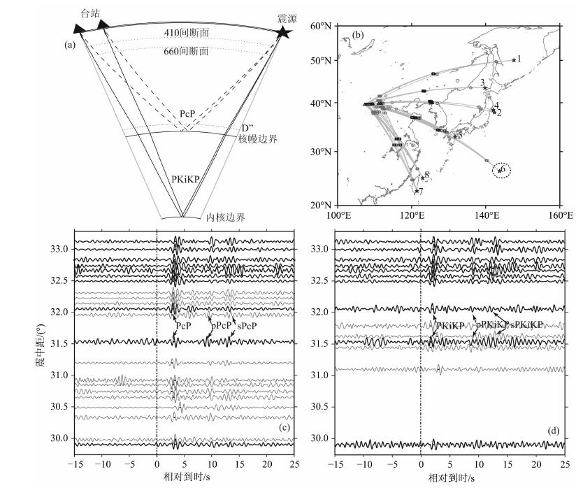 前临界PKiKP因能量微弱而不易识别,其最初观测[20]便来自台阵叠加结果.本研究表明,密集台阵确能有效识别该震相信号,并显著抑制背景随机噪声引起的振幅离散.日本岛弧东南海域前临界PKiKP的发现[30]证实了这一区域尖锐的内核边界,而本研究则使上述结构向西和北进一步延拓,揭示了东亚-西北太平洋清晰ICB的广泛分布.从事件目录(表 1)可以看出:1)有效观测的发震时刻均对应台阵所处时区(GMT+8)的深夜及凌晨,这也正是环境噪声最弱时段;2)浅源地震(<70km)占据了有效事件的半数以上(5/8),表明浅源地震同样是高质量数据(图 1c-1d和图 2)的可能来源,这与其它研究[24, 27]中广泛采用的深震标准相出入.前人研究之所以优选深源地震主要因为浅部介质不均匀和浅震震源的复杂性.而实际上,浅部路径的相似性在一定程度上减轻震源附近结构的影响.以震源深度30km,震中距30°,频率1 Hz的波场为例,PcP和PKiKP在100km深度穿透点间隔约30km,而Fresnel半径却不小于20km.另外,较小震级(不大于6.0mb,见表 1)的选取确保了相对简单的震源时间函数.因此,更严格的发震时刻选择以及宽松的震源深度限定有助于有效事件检出数目和效率的提高.