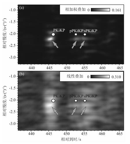 图 2为事件6慢度域叠加能量在PKiKP理论值附近的分布,其中图 2a和图 2b分别对应相加权叠加和线性叠加结果.为压制时钟误差和高程起伏等台站源扰动,偏移均参考PcP进行.两种叠加方法均给出了理论相对到时-慢度附近的能量极值,而pPKiKP和sPKiKP在PWS能量图中亦清晰可见,验证了观测结果的可靠性,同时也展示了相加权方法在弱信号拾取上的巨大优势[29].