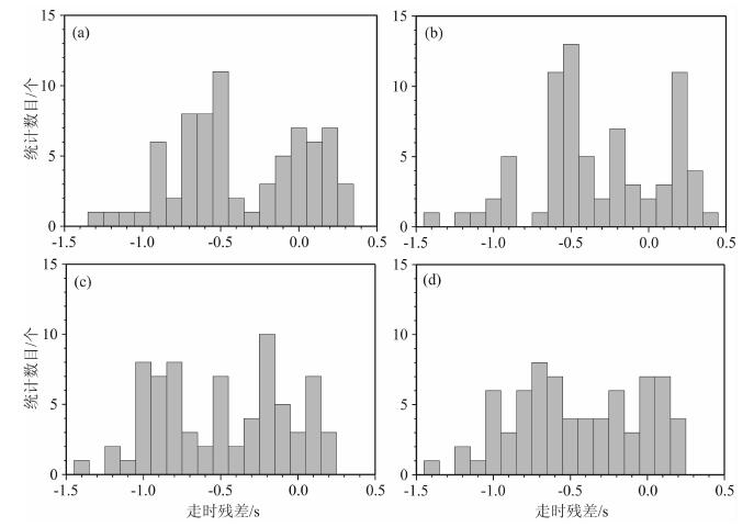 图 3 走时残差的统计直方图 (a)原始观测;(b)扁率校正结果;(c)地幔校正结果;(d)最终结果(对原始数据进行地幔校正和扁率校正). Fig. 3 Statistical histogram of travel time residues after various corrections (a) Primitive observation; (b) After elliptic correction; (c) After mantle correction; (d) Final results (primitive data processed by both elliptic and mantle correction). |