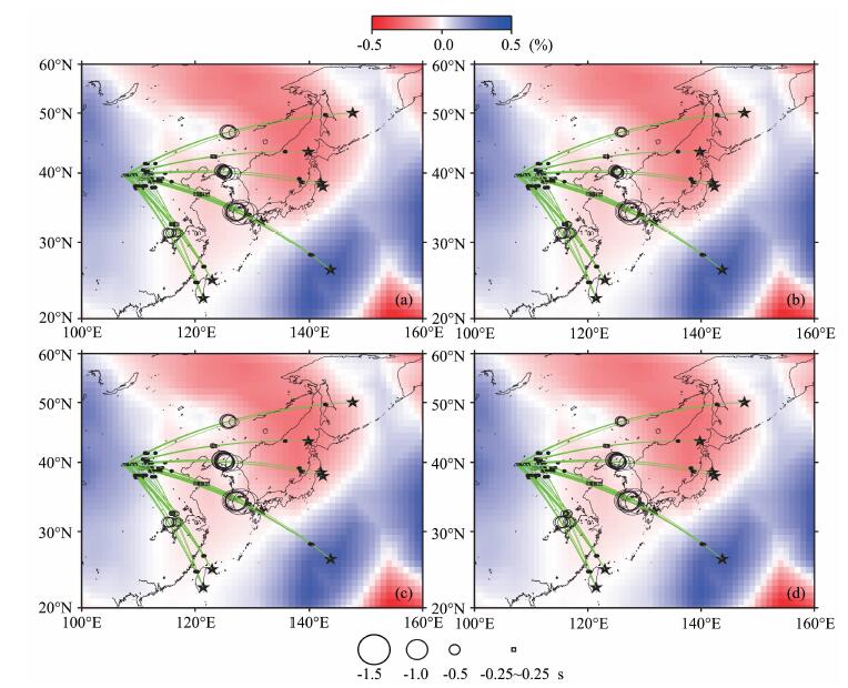 图 4 走时残差(空心圆圈,残差小于-0.25s;正方框,残差绝对值不大于0.25s)的地理分布,符号位置对应PKiKP的ICB反射点;绿色实线、黑色圆点、黑色五角星和青色黑边三角形分别对应PKiKP大圆弧路径,CMB透射点,震源和台站在地图上的投影;底图为层析成像结果[25]给出的CMB附近地幔纵波波速扰动 (a)原始观测;(b)扁率校正结果;(c)地幔校正结果;(d)最终结果(对原始数据进行地幔校正和扁率校正). Fig. 4 Geographical distribution of travel time residues (hollow circle, residue lower than -0.25s;hollow square, absolute no greater than 0.25s), symbols located at ICB reflected points of PKiKP; green lines are map projection of great-circle paths for PKiKP with black stars indicating epicenters; black dots stand for piercing points of PKiKP on CMB and cyan triangles with black frame for stations; tomography inversion[25] for VP perturbation near CMB is plotted as basemap. (a) Primitive observation; (b) After elliptic correction; (c) After mantle correction; (d) Final results (primitive data processed by both elliptic and mantle correction). |