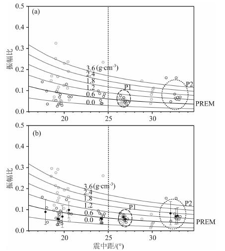 图 5 振幅比的震中距分布 (a)校正前振幅比的震中距分布:空心圆圈(灰色+黑色)为振幅比总数据(73个),其中黑色小圆圈是筛选所得数据(37个);0.0~3.6(g/cm3)等6个数字正下方为对应ICB密度差的理论曲线,其中黑色曲线为PREM(0.6g/cm3)预测结果;连接(25,0.0)至(25,0.5)的点线界定了震中距>25°(且<50°)的ICB密度差专属敏感区间;椭圆形虚线和点线指示的数据点(震中距大于25°)分别对应“P1(正常或略低ICB密度差)”和“P2(不小于2倍PREM密度差)”模型.(b)校正后结果:黑色实心圆点为所选样本子空间1°窗口的平均结果,纵向误差取1σ,其余注释同(a). Fig. 5 Distribution of amplitude ratios with epicenter distance (a) Distribution of amplitude ratio before correction:hollow circles (grey+black) are amplitude ratio results with black ones referring to the selected sample; the six numbers of 0.0~3.6 (g/cm3) indicating ICB density contrasts of the theoretical curves right below, of which the black one calculated by PREM; the elliptical dash line and dotted line bracket clusters of data (epicenter distance greater than 25°) implicating "P1 (normal or a bit lower ICB density contrast)" and "P2 (no less than 2 times of the PREM value)"model, respectively.(b) Distribution of amplitude ratio after correction:black solid dots, with vertical error bar equal to 1σ, show the results of averaging with 1° window; the other illustrations are the same as (a). |