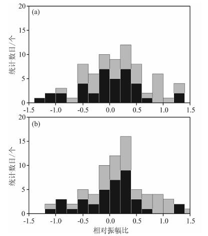 图 6 相对振幅比的统计直方图,其中灰色对应总数据(共计73组),黑色对应挑选后数据(共计37组) (a)校正前结果;(b)校正后结果. Fig. 6 Statistical histogram of amplitude ratios, with total data (73) in grey and select edones (37) in black (a) Results before correction; (b) Results after correction. |