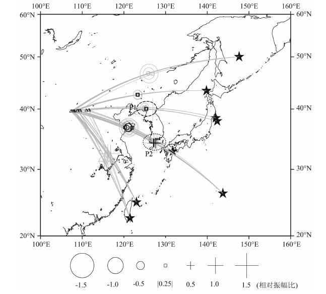 图 7展示了校正后相对振幅比(对应图 5b及图 6b数据)的空间分布.灰色和黑色符号分别对应单道观测和平均结果.受数据取舍影响,筛选所得37道数据平均值的空间覆盖远不及走时残差,但所得结果依然存在一定的地理分布规律.参照图 5,虚线和点线圈定的“P1”“P2”区域揭示25°~50°(ICB密度差敏感区间)震中距范围内相对振幅比观测的北西-南东向的系统变化.