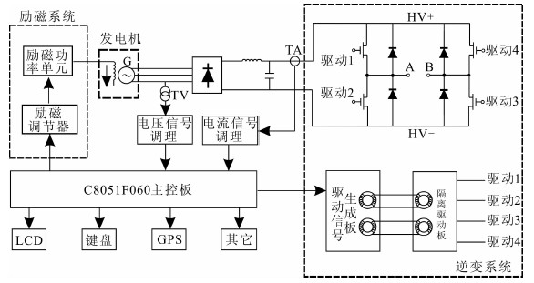 2 发送机系统结构与原理如图 1所示,本发送机系统包括了励磁电流控制系统,发电机体,整流滤波,逆变系统,电压、电流的采集,GPS模块,键盘以及LCD显示器等.