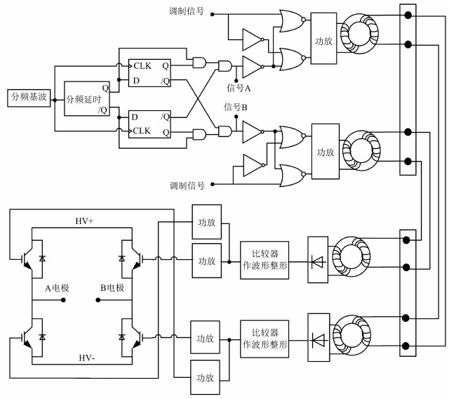 信号A,B生成后,利用一个调制信号,对其进行调制,调制后的信号通过线圈耦合过程送到驱动模块,驱动模块对送过来的信号进行解调,还原A,B信号,再对其进行功率放大去驱动IGBT,从而很好地实现了对频率发生系统与驱动系统的隔离作用.