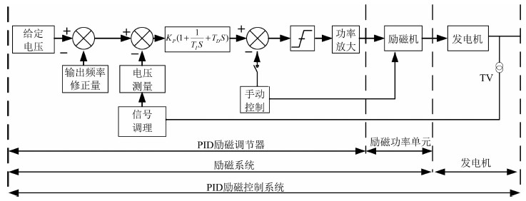 该系统输出电压的控制是基于数字增量式PID对励磁电流的控制来实现的.PID系统采用的是对发电机的相电压进行采样,并通过数字增量式PID的算法来获得下一步需要调整励磁电流大小DAC输出值,从而实现系统的输出电压的动态控制.