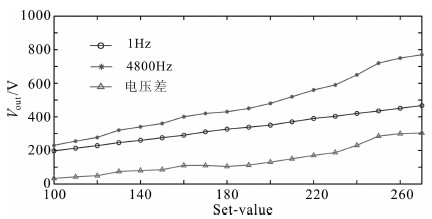 图 5给出线径为0.2 cm,长为1.2 km的供电线,接地电阻为60 Ω左右的条件下,通过设置不同的设定值(与给定电压值相关),测量发送频率为1 Hz与4800 Hz条件下的输出电压(直流母线电压)曲线.图中的电压差曲线表示在某一设定值条件下高频电压减去低频电压的值.从曲线的形态很容易看出,在低频条件下,设置值与输出电压是简单的线性关系,但是在高频条件下,设置值越高,高频发送对应的输出电压相差越大.