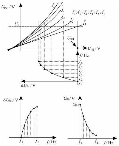图 7给出了该系统的频率输出特性曲线,图中U相1为发送f1频率时对应的相电压,利用输出直流电压与相电压如图 5的关系得到了输出直流电压不变条件下,相电压与发送频率之间的关系.其中f1是最低的发送频率(通常小于等于1 Hz).