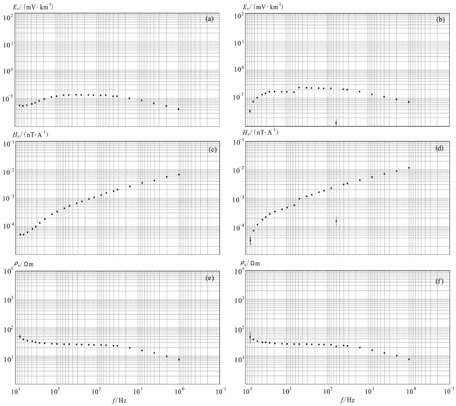 图 9 实验结果 (a)V8发送机获得的电场幅频曲线;(b)本系统获得的电场幅频曲线;(c)V8发送机获得的磁场幅频曲线;(d)本系统获得的磁场幅频曲线;(e)V8发送机获得的视电阻率幅频曲线;(f)本系统获得的视电阻率幅频曲线. Fig. 9 Experimental result (a) Electric field amplitude frequency curve of V8 transmitter; (b) Electric field amplitude frequency curve of this transmitter; (c) Magnetic fieldamplitudefrequencycurveofV8transmitter; (d) Magneticfieldamplitudefrequencycurveofthistransmitter; (e) Apparentresistivity amplitude frequency curve of V8 transmitter; (f) Apparent resistivity amplitude frequency curve of this transmitter. |